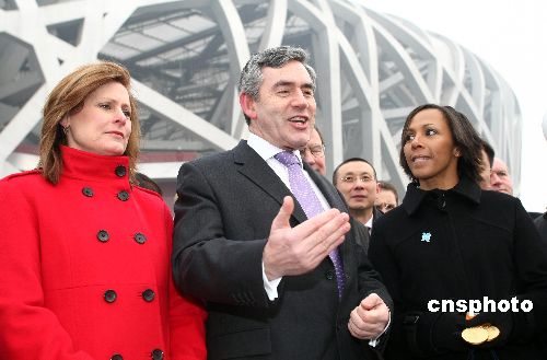 布朗攜夫人薩拉·布朗(左一)以及英國著名女運動員、雅典奧運會冠軍凱莉·霍爾姆斯(右一)等,參觀2008年北京奧運會主體育場“鳥巢”。