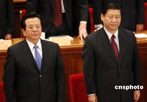 3月3日下午,全國政協(xié)十一屆一次會議在北京人民大會堂開幕,國家副主席曾慶紅(左)、中共中央政治局常委習近平出席。中新社發(fā) 任晨鳴 攝