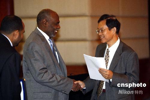 6月26日,以“和平、發(fā)展”為主題的蘇丹達(dá)爾富爾問(wèn)題國(guó)際研討會(huì)在北京舉行,中國(guó)政府達(dá)爾富爾問(wèn)題特別代表劉貴今(右)和參會(huì)代表在會(huì)前交談。中新社發(fā) 杜洋 攝