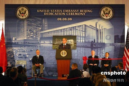 八月八日,美國駐華大使館舉行了隆重的新館開館儀式,前來出席北京奧運會開幕式的美國總統(tǒng)布什、前總統(tǒng)老布什,以及中國國務(wù)委員戴秉國出席儀式并致辭。中新社發(fā) 阮煜琳 攝