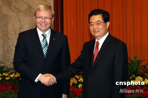 八月九日,中國(guó)國(guó)家主席胡錦濤在北京人民大會(huì)堂會(huì)見(jiàn)澳大利亞總理陸克文。中新社發(fā) 任海霞 攝