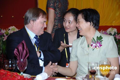 這是國務(wù)院僑辦副主任許又聲(左)與參加晚宴的華商親切交談。