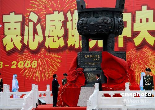 9月22日,中共中央政治局常委、中央紀(jì)委書(shū)記賀國(guó)強(qiáng)(左),與寧夏回族自治區(qū)黨委書(shū)記陳建國(guó),一同為中央贈(zèng)送寧夏的民族團(tuán)結(jié)寶鼎揭幕。當(dāng)日上午,以賀國(guó)強(qiáng)為團(tuán)長(zhǎng)的中央代表團(tuán)乘專(zhuān)機(jī)抵達(dá)銀川,參加寧夏回族自治區(qū)成立50周年慶;顒(dòng)。中新社發(fā) 廖攀 攝