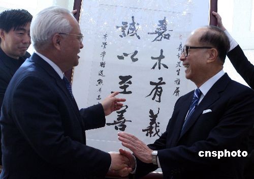民政部長李學舉(左)向李嘉誠贈送禮品。