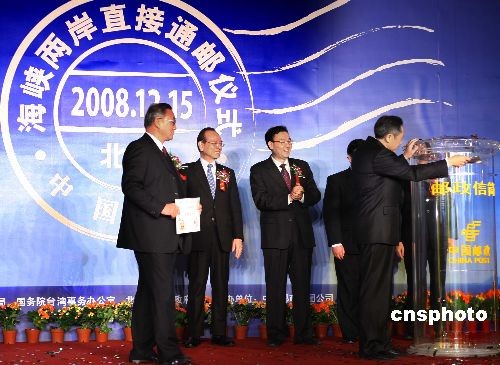 12月15日,由國家郵政局、國務(wù)院臺灣事務(wù)辦公室、北京市政府主辦、中國郵政集團(tuán)承辦的海峽兩岸直接通郵儀式,與會佳賓向臺灣投遞第一批信件,標(biāo)志著海峽兩岸將實現(xiàn)全面、直接、雙向通郵,直接開辦各項郵政業(yè)務(wù)。大陸方面郵件封局為北京、上海、廣州、福州、廈門、西安、南京、成都,臺灣方面郵件封局為臺北、高雄、基隆、金門、馬祖。中新社發(fā) 宋吉河 攝