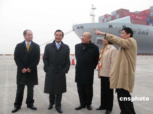 12月20日下午,中共中央臺辦主任王毅陪同中國國民黨主席吳伯雄一行前往上海洋山深水港參觀。中新社發(fā) 張子揚(yáng) 攝