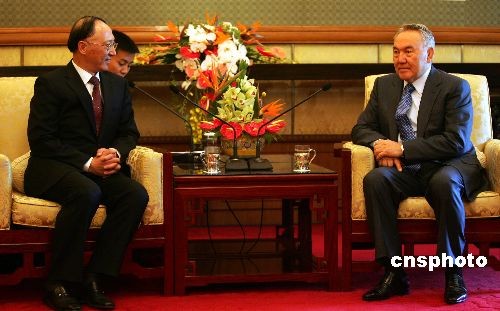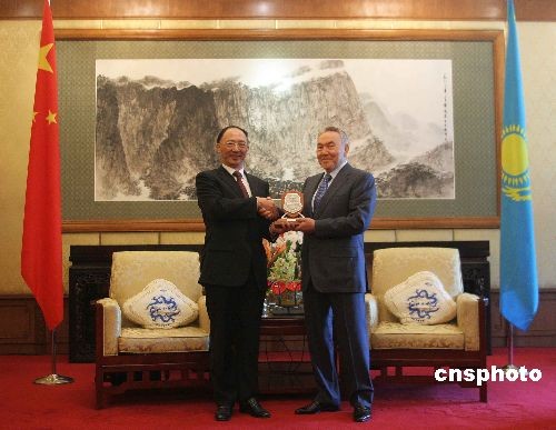4月16日,中國(guó)國(guó)家體育總局局長(zhǎng)、中國(guó)奧委會(huì)主席劉鵬在北京釣魚臺(tái)國(guó)賓館會(huì)見哈薩克斯坦總統(tǒng)納扎爾巴耶夫,并向納扎爾巴耶夫總統(tǒng)頒發(fā)中國(guó)奧委會(huì)勛章,以表示其對(duì)中國(guó)體育事業(yè)的支持。納扎爾巴耶夫此行是應(yīng)中國(guó)國(guó)家主席胡錦濤邀請(qǐng),于15日傍晚抵達(dá)北京,開始對(duì)中國(guó)進(jìn)行為期5天的國(guó)事訪問。訪華期間,納扎爾巴耶夫?qū)⑴c中國(guó)國(guó)家主席胡錦濤、全國(guó)人大常委會(huì)委員長(zhǎng)吳邦國(guó)和國(guó)務(wù)院總理溫家寶進(jìn)行會(huì)見,他還將出席博鰲亞洲論壇2009年年會(huì),這是納扎爾巴耶夫2005年連任總統(tǒng)以來第2次對(duì)中國(guó)進(jìn)行國(guó)事訪問。中新社發(fā) 富田 攝