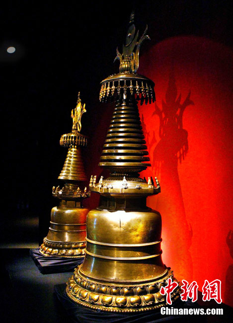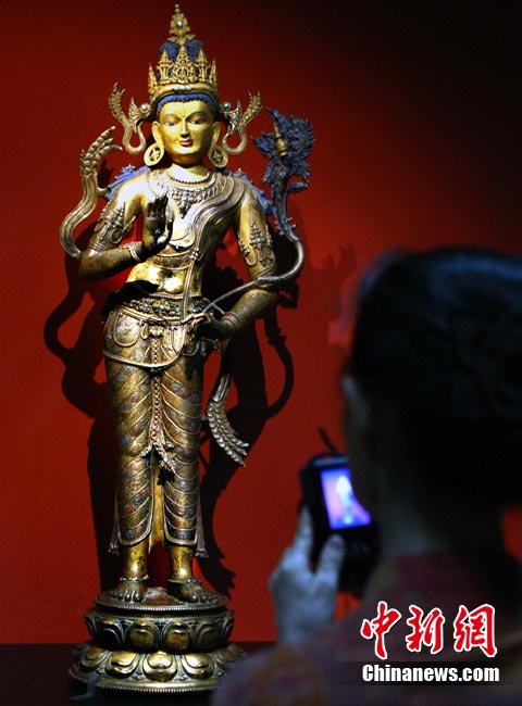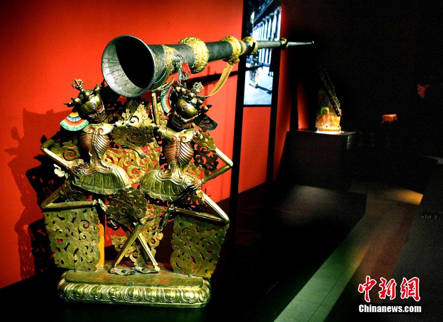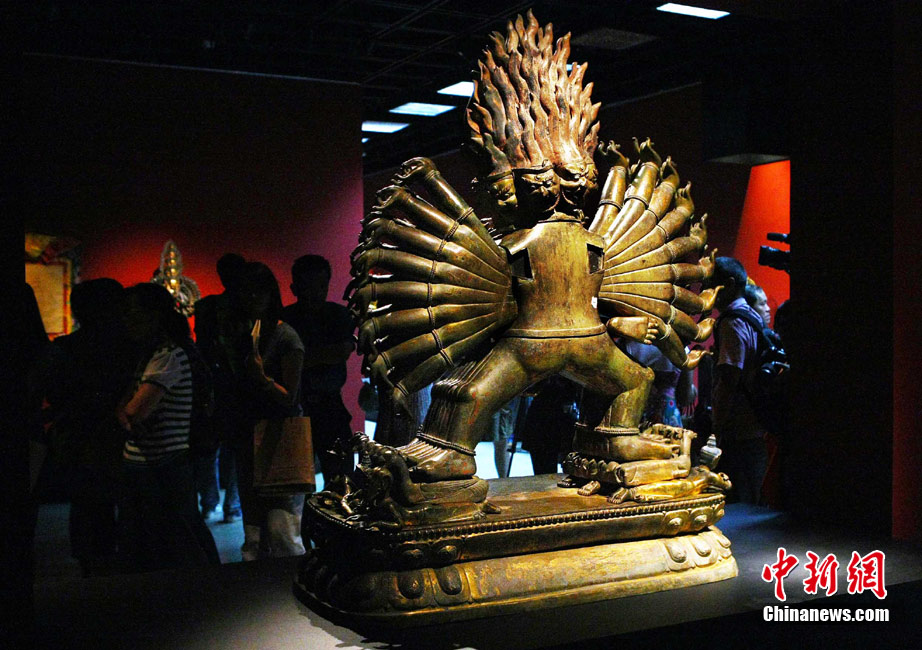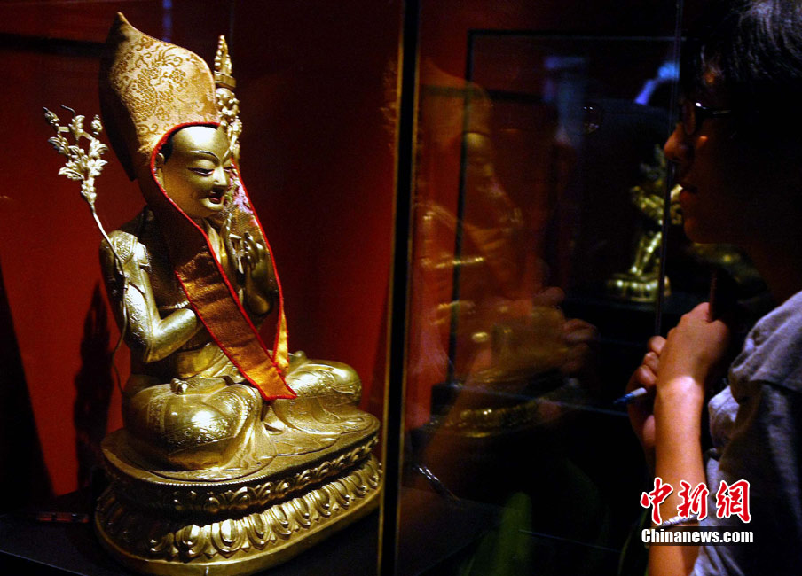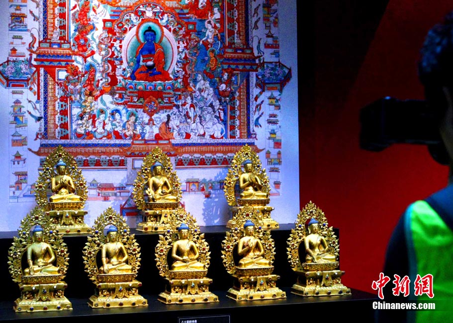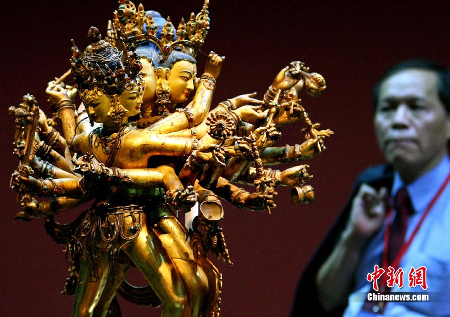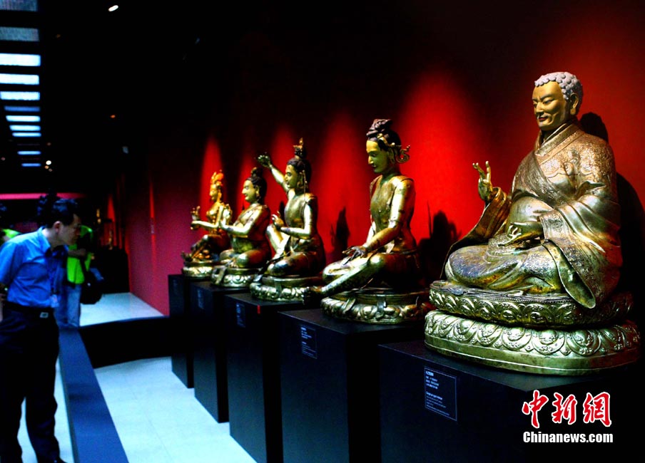 “圣地西藏---最接近天空的寶藏”特展,6月30日在臺灣故宮博物院揭開面紗。這次展覽是臺灣歷年來規(guī)格最高、面向最完整的西藏文化與文物展,展出的130組件文物,來自西藏布達(dá)拉宮、羅布林卡等寺廟、西藏博物館、承德避暑山莊和北京民族文化宮等12處文物重鎮(zhèn)。整個展覽按“吐蕃王朝”、“金色寶藏”、“文化交流”、“雪域風(fēng)情”四部分布局展出,展覽9月19日結(jié)束。中新社記者 宋吉河攝