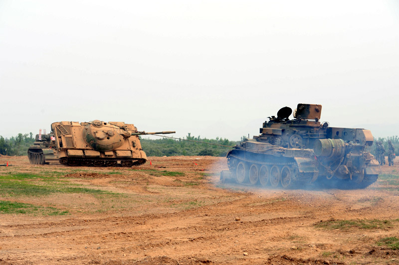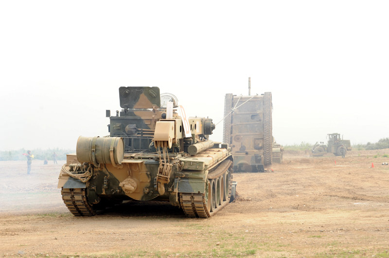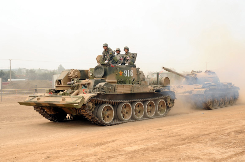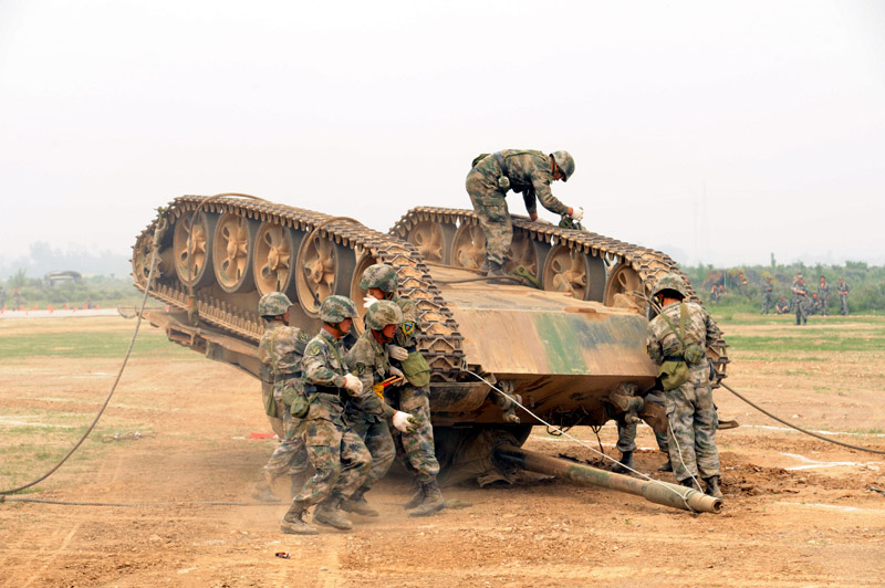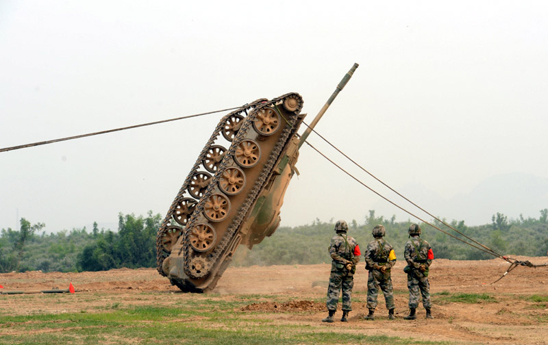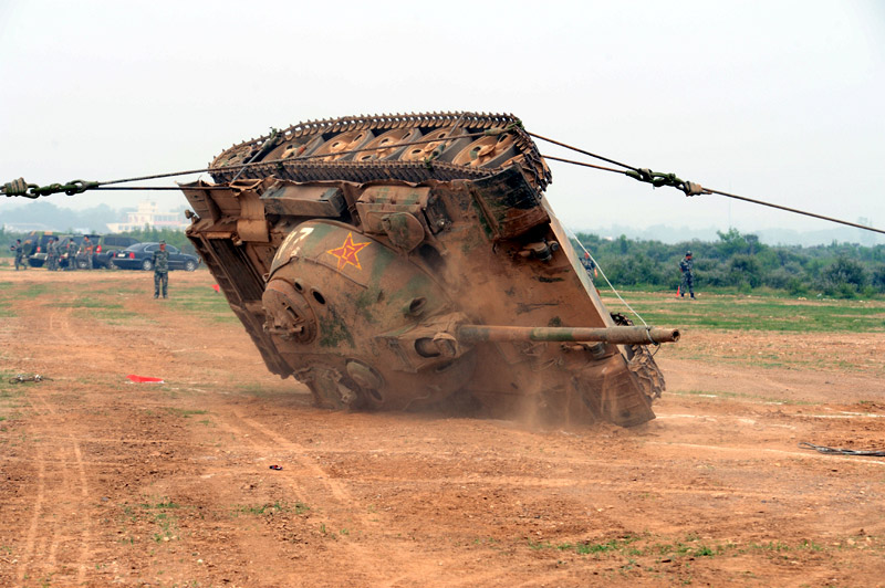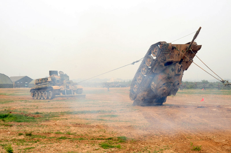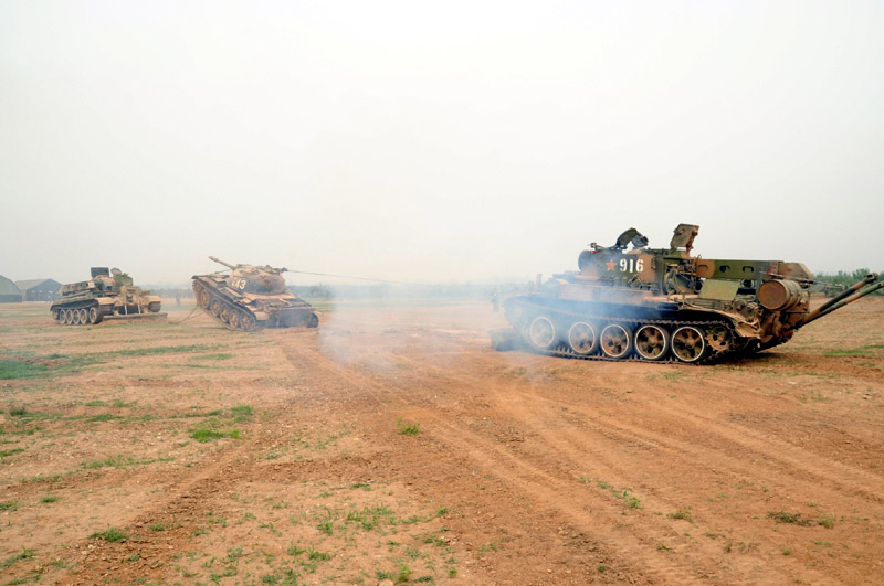 6月29日,北京軍區(qū)基礎(chǔ)比武進(jìn)入第二天,裝甲搶救車牽引訓(xùn)練坦克駛?cè)氡任洮F(xiàn)場(chǎng)。圖片來源:新華網(wǎng) 高航 攝