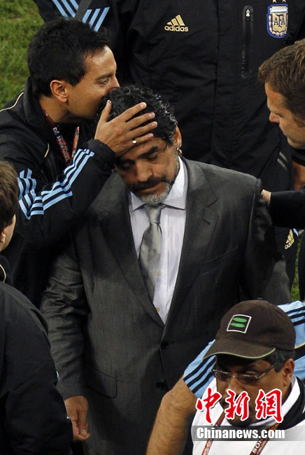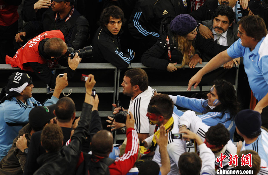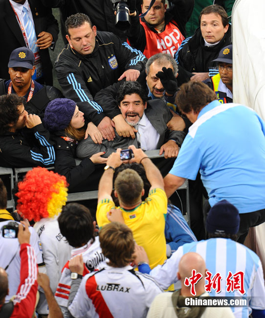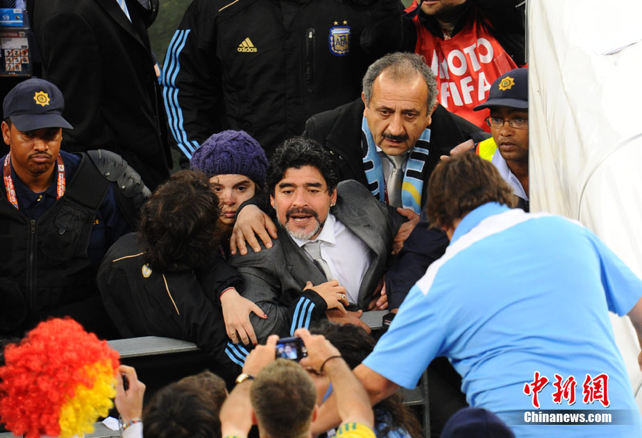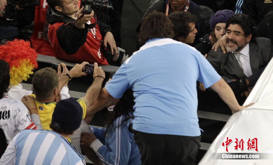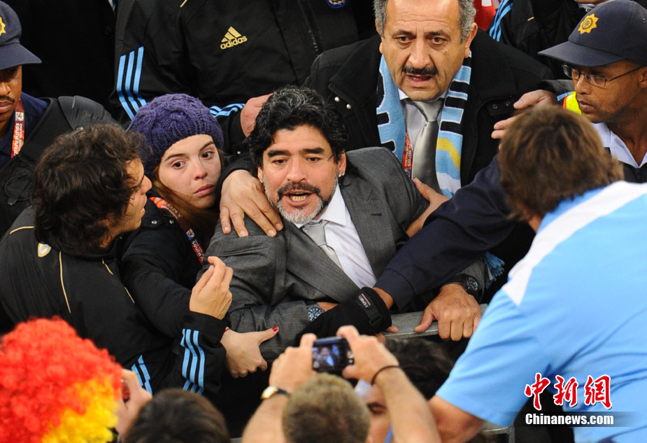 南非世界杯阿根廷與德國隊的比賽結(jié)束后,瘋狂的德國球迷對馬拉多納進行了辱罵和奚落,急脾氣的老馬轉(zhuǎn)身沖向看臺與球迷理論,他更是要爬上看臺親手教訓(xùn)這些球迷。好在大女兒達爾瑪和阿根廷教練組成員及時前往制止,否則后果將不堪設(shè)想。