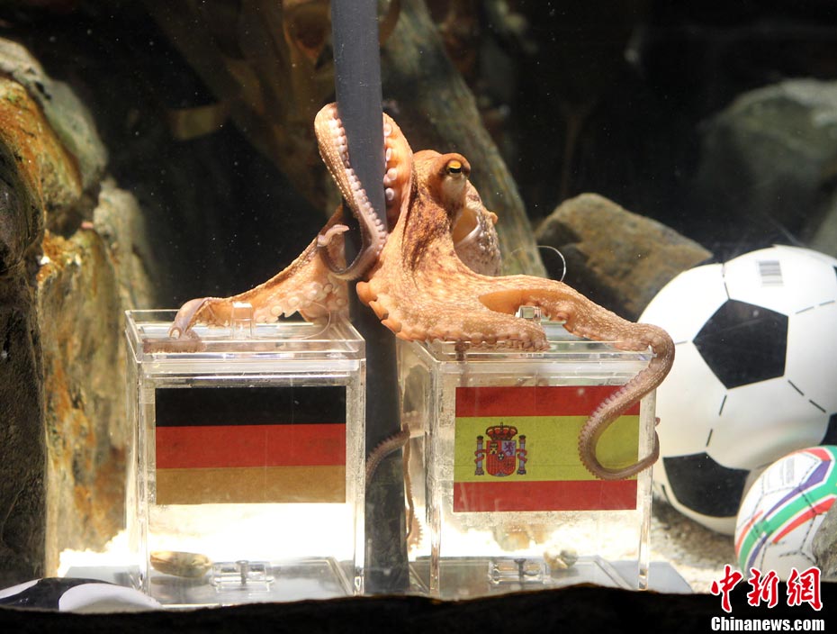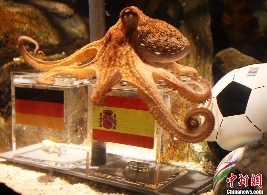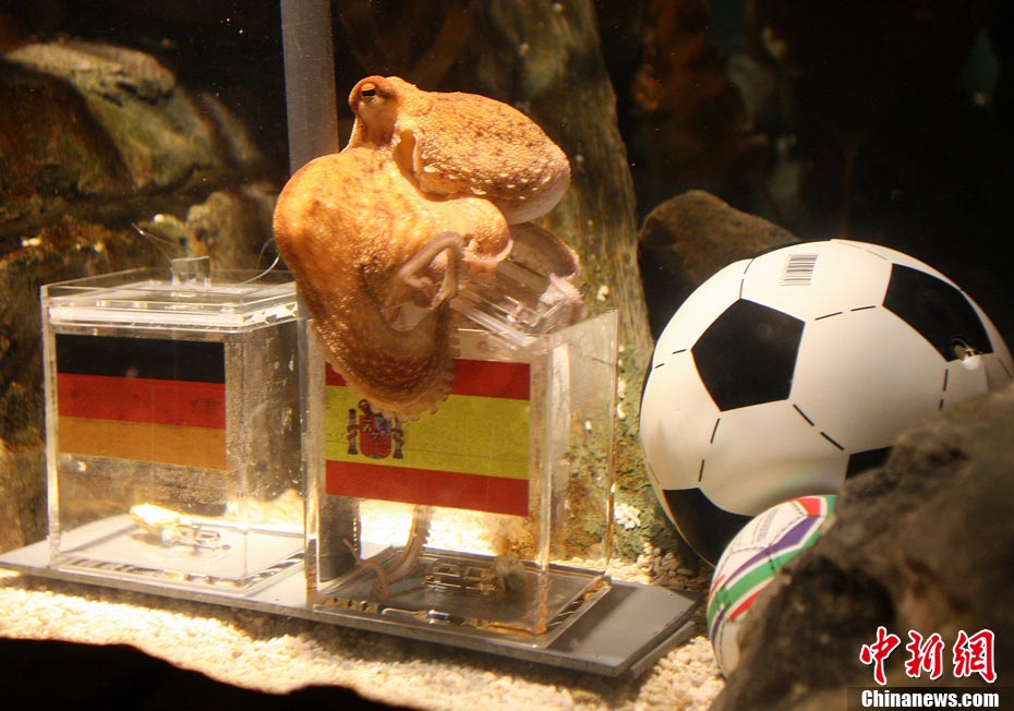 7月6日下午,德國(guó)某水族館的章魚保羅再次出動(dòng),對(duì)世界杯半決賽德國(guó)與西班牙進(jìn)行了預(yù)測(cè),最終他選擇了西班牙。保羅認(rèn)為歐洲冠軍西班牙將在半決賽擊敗勢(shì)頭強(qiáng)勁的德國(guó)隊(duì)進(jìn)入決賽。《圖片報(bào)》網(wǎng)站的直播員在公布結(jié)果的同時(shí)說道:“希望勒夫的小伙子們能扭轉(zhuǎn)局勢(shì),拯救這場(chǎng)半決賽!被蛟S,對(duì)于德國(guó)球迷來說還有一個(gè)自我安慰的理由:保羅在2008年歐錦賽上預(yù)測(cè)的準(zhǔn)確率是80%,并且唯一錯(cuò)的就是決賽與西班牙之戰(zhàn)。他們或許已經(jīng)開始期待:兩年后的世界杯預(yù)測(cè)不要百發(fā)百中,至少在半決賽時(shí)錯(cuò)一次。