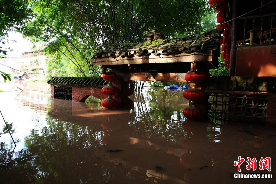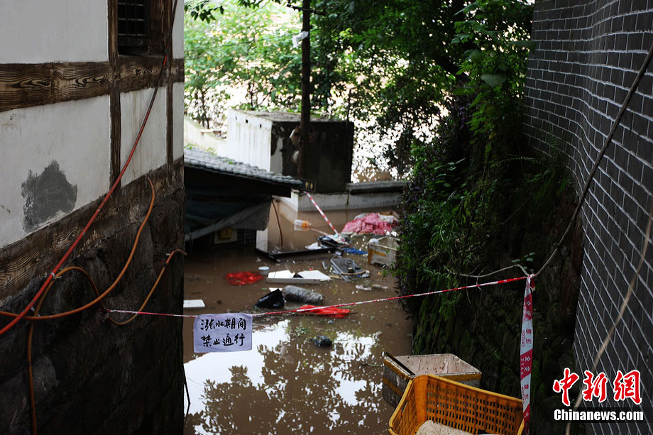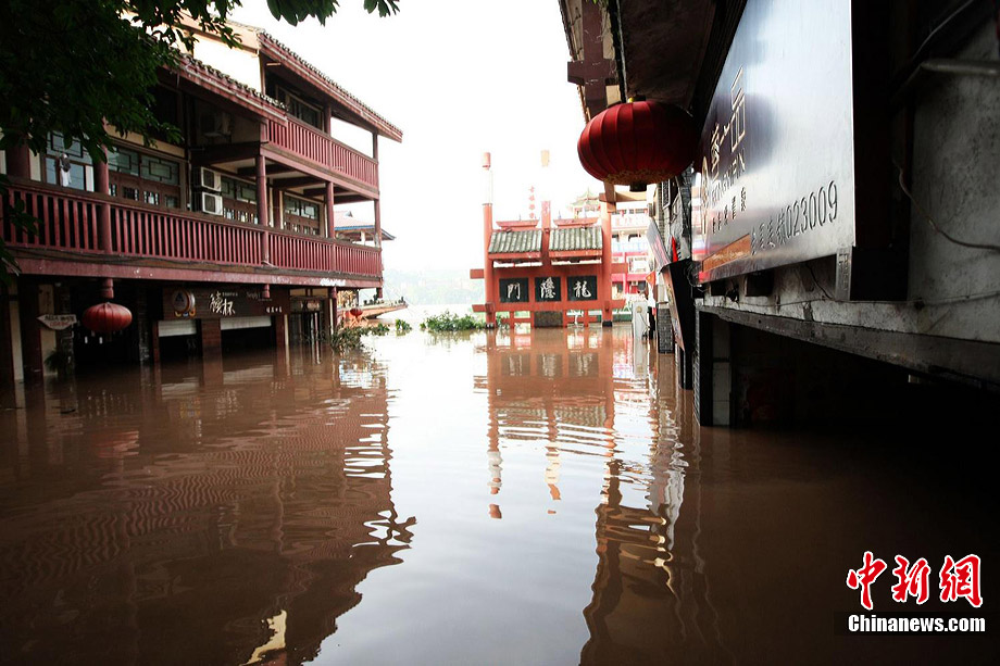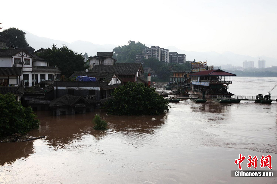 7月19日,今年入汛以來最大洪峰經(jīng)過重慶主城,長江、嘉陵江水位上漲。記者在重慶古鎮(zhèn)磁器口看到,從磁器口江邊至磁器口街道的梯坎已“隱”于水面下,標(biāo)志性牌匾龍隱門沒至“腰部”,靠近江邊的商鋪及民居被淹。目前,大部分商家、市民接預(yù)警已提前撤場歇業(yè)或撤離至安全地帶。截至記者趕赴磁器口途中,部分必經(jīng)路段已實(shí)施交通管制,磁器口正街漲水期間亦采取禁行措施。據(jù)長江水利委員會水文局監(jiān)測數(shù)據(jù),19日20時(shí)長江重慶寸灘站水位超過185米,這是重慶遭遇的長江今年以來最大洪峰。截至20日0時(shí),長江重慶水位仍在185.06米的峰值上流動,洪峰仍在過境重慶。 劉函冉 攝