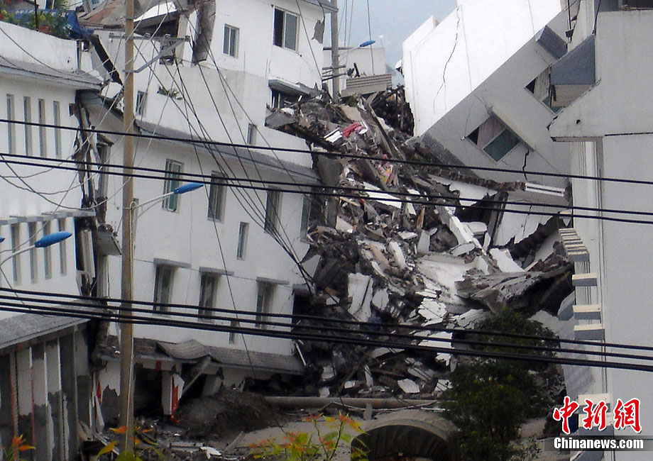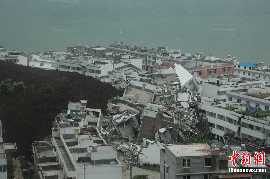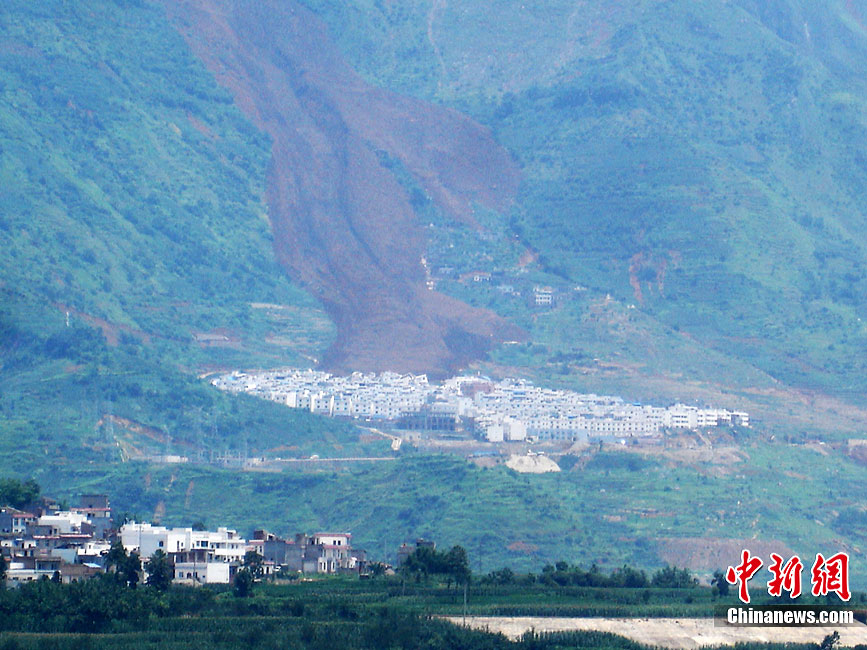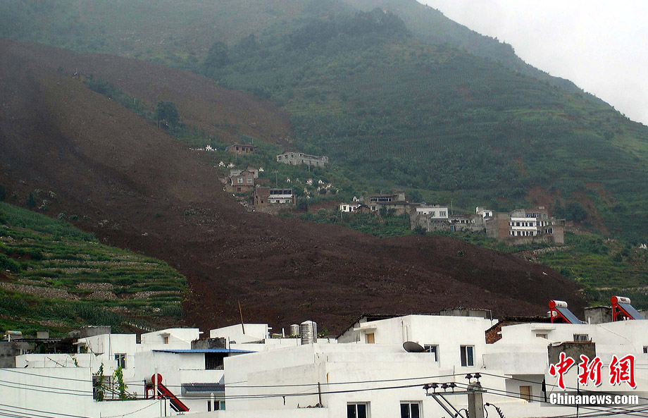 7月27日凌晨5時許,因連日來的持續(xù)強降雨和暴晴天氣,四川雅安市漢源縣萬工鄉(xiāng)雙合村一組萬工集鎮(zhèn)后背山(小地名二蠻山)突發(fā)滑坡,方量約10萬方,造成萬工集鎮(zhèn)、雙合一組部分村民房屋垮塌。初步核實共有58戶房屋受損、21人失蹤。初步勘明強降雨形成的新滑坡推移引發(fā)泥石流,方量約10萬方。由于垮滑現(xiàn)場實施救援較為危險,滑坡暫時被房屋擋住,隨時可能推到房屋再次下滑,救援人員已經(jīng)全部撤離。災害發(fā)生后,當?shù)匮杆僬{(diào)集武警、消防等98人趕赴現(xiàn)場救援,還有230人待命。目前,帳篷、食品、飲用水等救災物資已陸續(xù)運往臨時安置點,尚未發(fā)現(xiàn)新增失蹤人員。圖為山體垮滑現(xiàn)場。中新社發(fā) 孫浩 攝