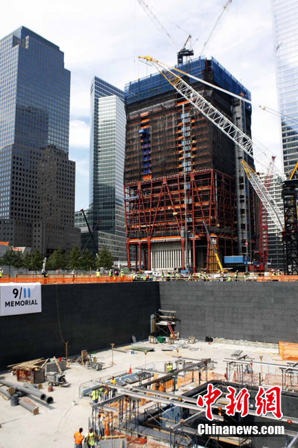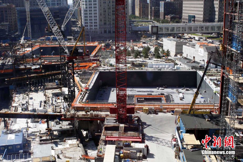 美國當(dāng)?shù)貢r間9月7日,記者在紐約世貿(mào)建筑工地現(xiàn)場看到,以原先世貿(mào)雙子塔樓基座為主體的兩個方形瀑布池業(yè)已成型,周圍也種上了些許綠樹。9·11紀(jì)念館館長喬·丹尼爾斯表示,肯定將在事件十周年紀(jì)念日當(dāng)天開館。中新社記者 孫宇挺 攝
