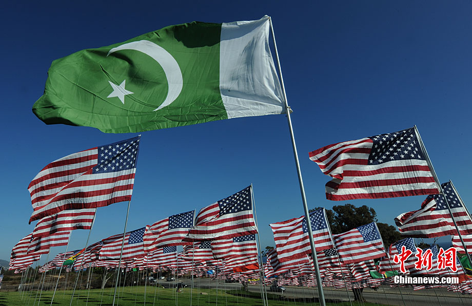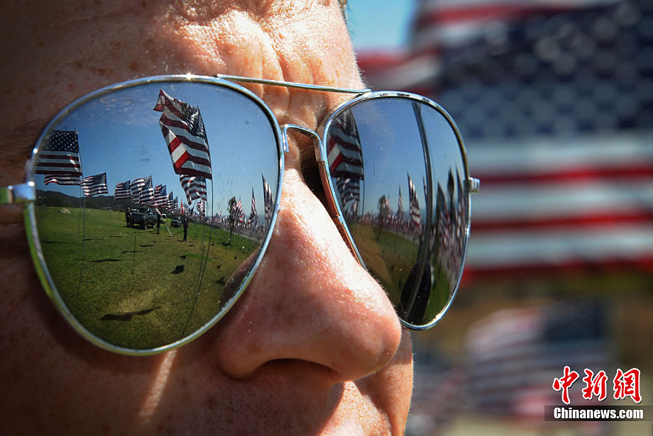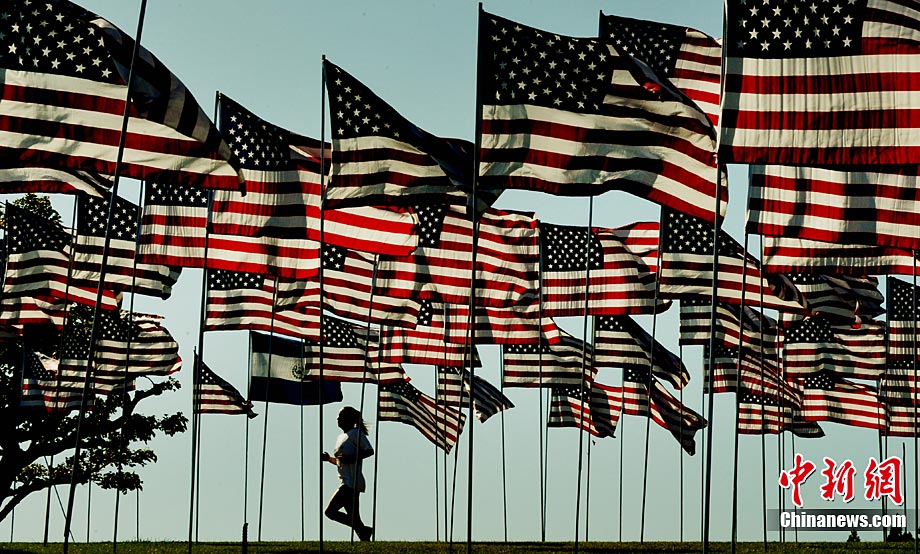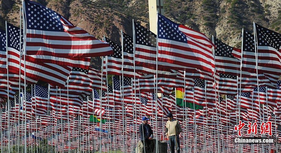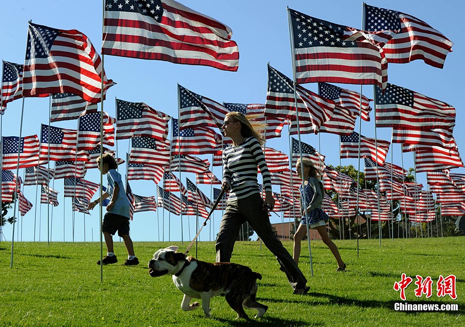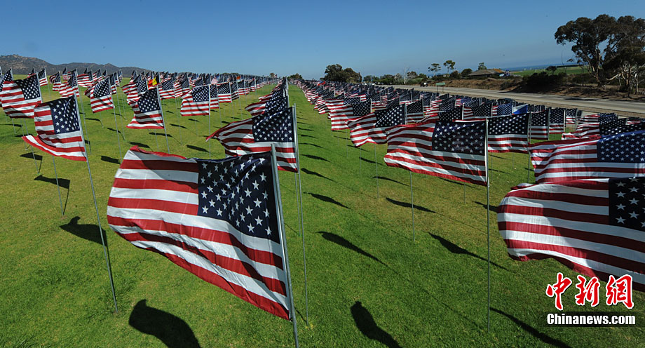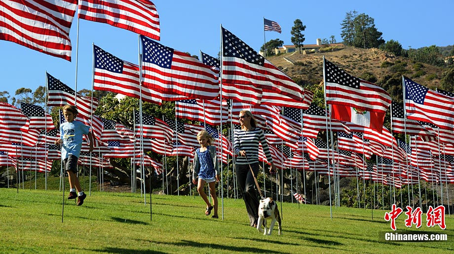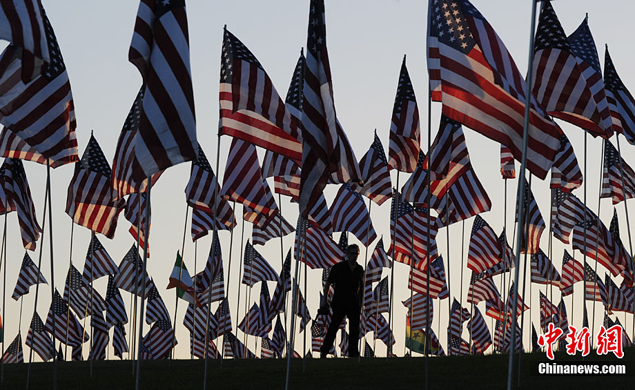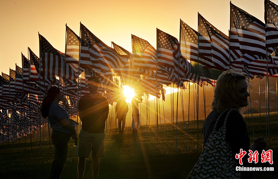 當(dāng)?shù)貢r(shí)間9月10日,在美國加利福尼亞州的馬里布,一些大學(xué)生在馬里布佩珀代恩大學(xué)的草坪上插上近3000面美國國旗和其它國家和地區(qū)的旗幟,紀(jì)念“9·11”恐怖襲擊事件的遇難者。