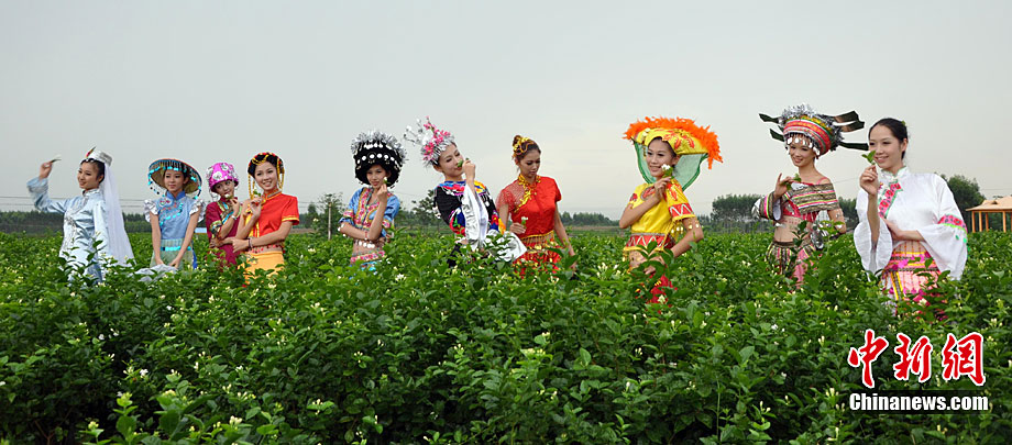 9月11日,“中國(guó)茉莉之鄉(xiāng)”廣西南寧橫縣,少數(shù)民族美女在“中華茉莉園”忙采茶。9月10日至12日,由中國(guó)花卉協(xié)會(huì)花文化專業(yè)委員會(huì)、中國(guó)茶葉流通協(xié)會(huì)茶館專業(yè)委員會(huì)和南寧市人民政府主辦的2010年中國(guó)國(guó)際茉莉花文化節(jié)在廣西橫縣舉行。橫縣是世界最大的茉莉花生產(chǎn)和花茶加工基地,茉莉花種植面積達(dá)到10萬(wàn)畝,花農(nóng)33萬(wàn)人,年產(chǎn)鮮花8萬(wàn)多噸,茉莉花產(chǎn)量和花茶加工總量均占全國(guó)80%以上,占世界的60%。中新社記者 楊志雄 攝