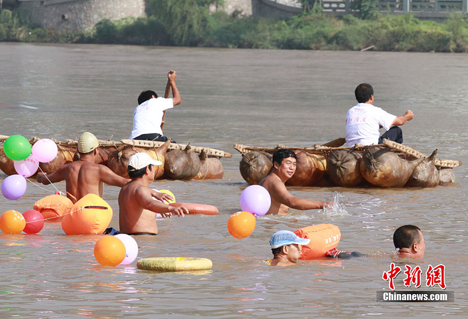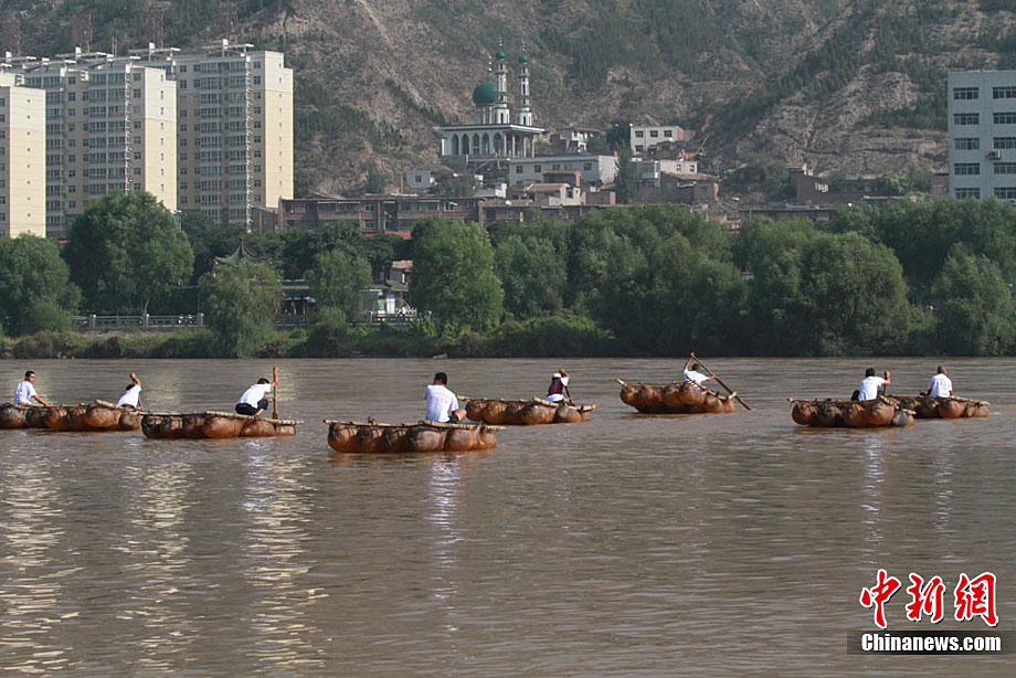 9月13日,蘭州第二屆羊皮筏子黃河漂流活動隆重舉行。羊皮筏子俗稱“排子”,是用山羊割去頭蹄,然后將囫圇脫下的羊皮扎口、吹滿氣而扎成,是一種古老的水運工具,如今已經(jīng)被淘汰,嬗變成當?shù)匾环N旅游項目。中新社記者 殷春永 攝