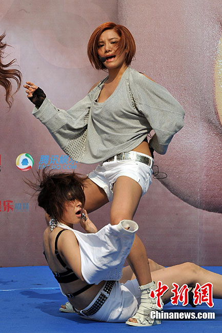 9月13日,09年快樂女聲冠軍VIVI江映蓉首張個(gè)人專輯《壞天使》全國(guó)媒體發(fā)布會(huì)在北京舉行。發(fā)布會(huì)上,置身于鐵籠子里的江映蓉由六名猛男抬上舞臺(tái),她所散發(fā)出的女王般的氣勢(shì)與危險(xiǎn)的性感氣息,抹殺了現(xiàn)場(chǎng)的大片菲林。江映蓉現(xiàn)場(chǎng)帶來(lái)了新專輯的主打歌《壞天使》,帶領(lǐng)眾舞者演繹火辣的她,跟隨節(jié)奏慢慢脫去身上的白色小外套,最后僅剩一件黑色十字比基尼在身,熱辣的舞蹈動(dòng)作讓現(xiàn)場(chǎng)溫度直線上升。中新社記者 李學(xué)仕 攝