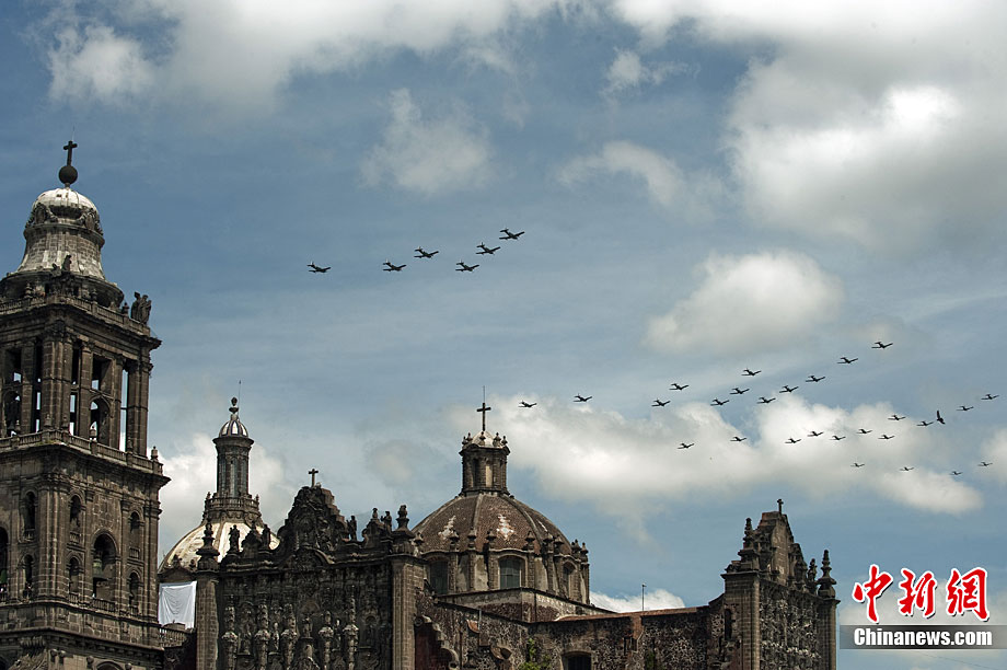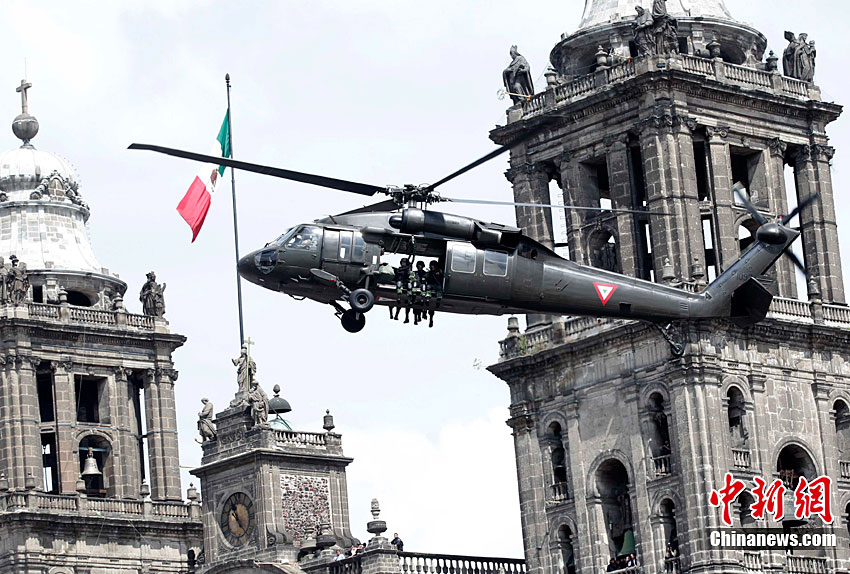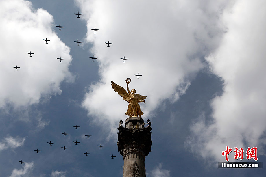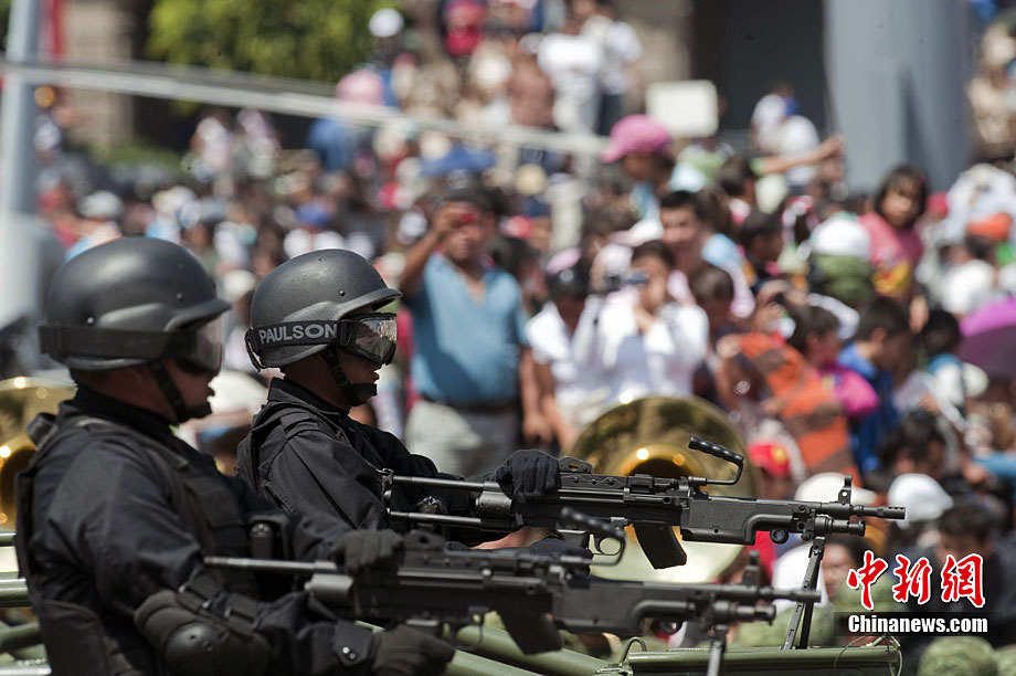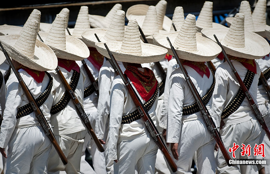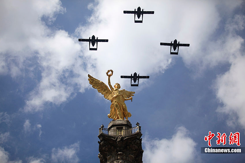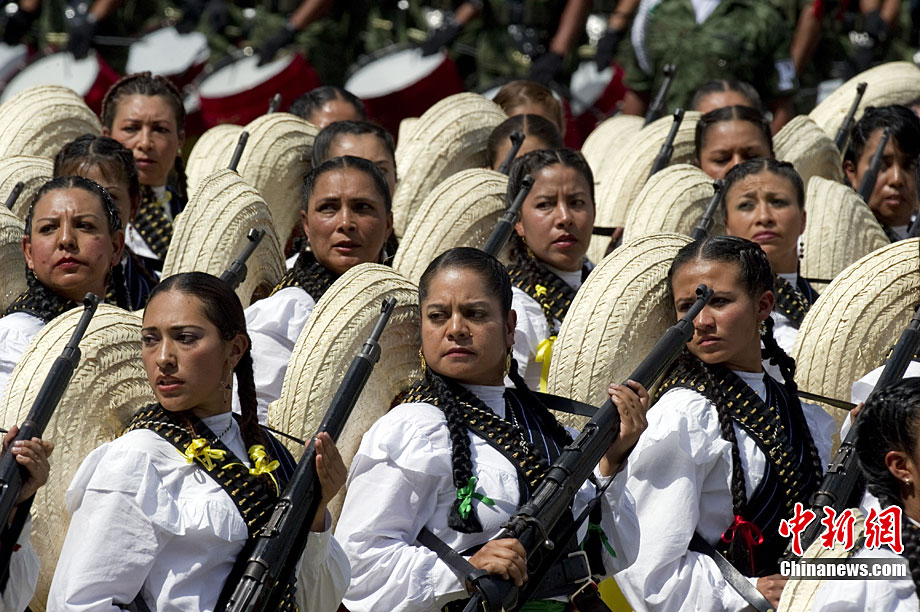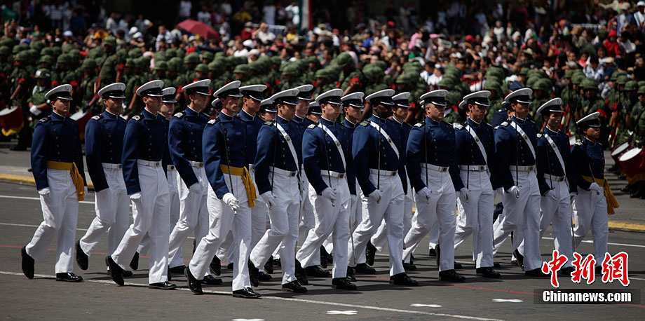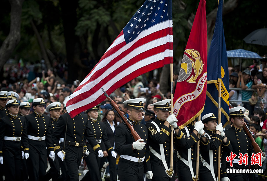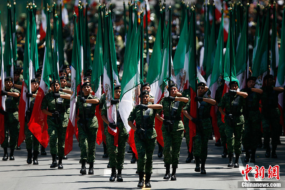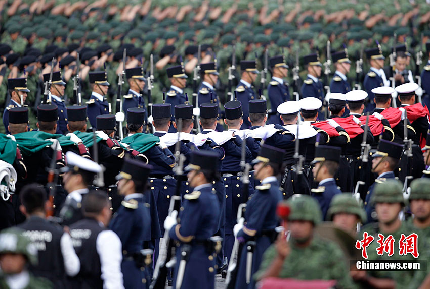 9月16日,在墨西哥首都墨西哥城,中國(guó)人民解放軍儀仗方隊(duì)參加墨西哥獨(dú)立200周年慶典閱兵。參加此次閱兵的中國(guó)儀仗隊(duì)由36人組成,其中34人編成方陣,最前方是1名旗手、5名護(hù)旗手,后隨1名陸軍指揮官,其身后列3隊(duì),陸?崭1列、每列9人。這是解放軍儀仗部隊(duì)首次走出國(guó)門遠(yuǎn)赴海外參加活動(dòng)。