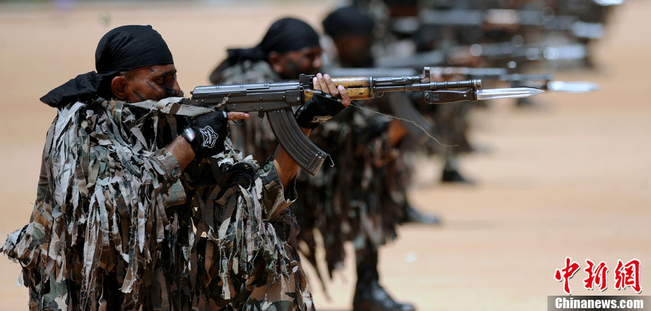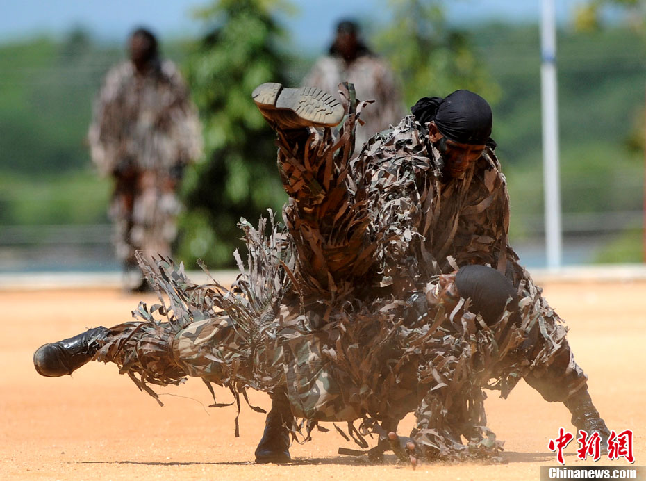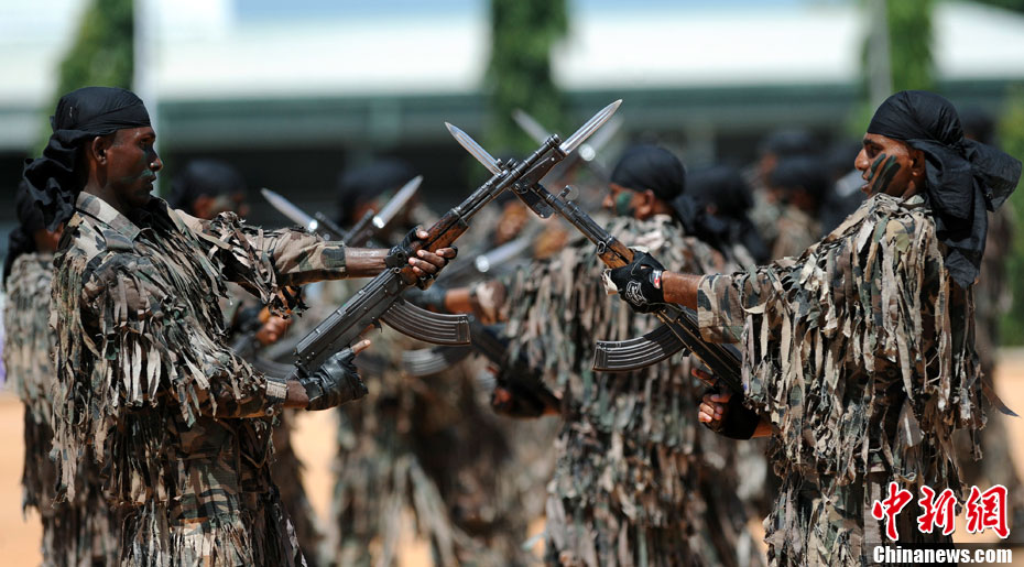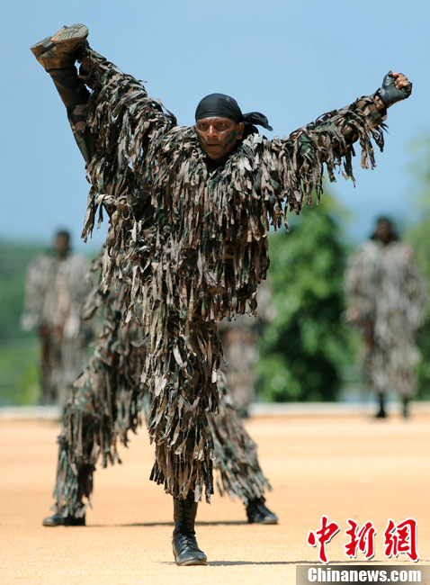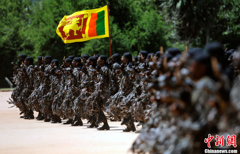 9月17日,在斯里蘭卡東北部城市亭可馬里舉行的空軍閱兵儀式上,116名空軍特種兵展示他們的各項技能。自2009年泰米爾猛虎組織(全稱,泰米爾·伊拉姆猛虎解放組織)的首領(lǐng)普拉巴卡蘭被擊斃,其基地被政府軍攻陷后,斯里蘭卡結(jié)束了長達25年的內(nèi)戰(zhàn),軍隊實力不斷增加。