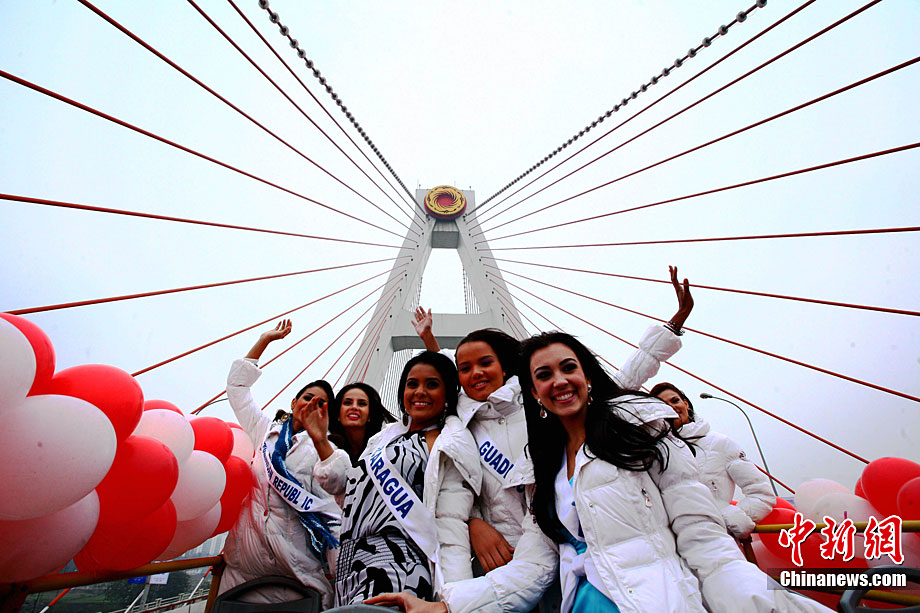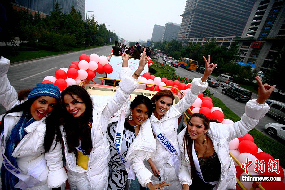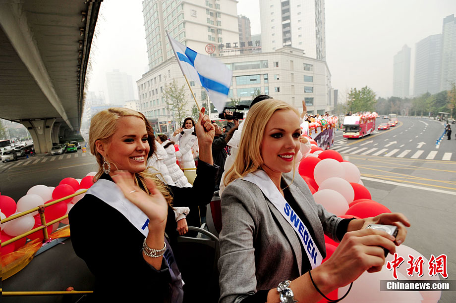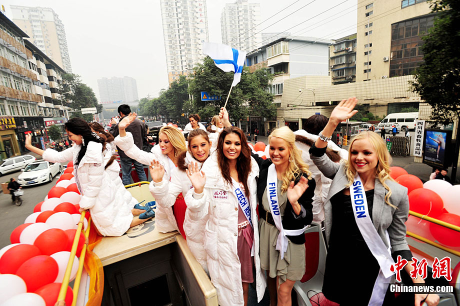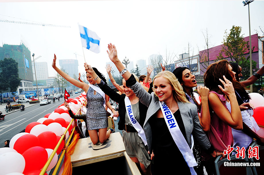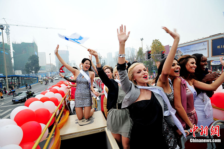 10月31日,國際小姐世界大會(huì)全球總決賽的70位參賽佳麗花車巡游成都市區(qū)。中新社發(fā) 安源 攝