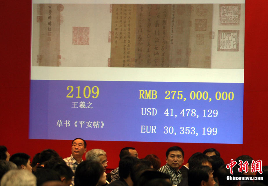 11月20日晚,在中國嘉德2010秋季拍賣會“秋光萬華——清代宮廷藝術集粹”專場中,王羲之草書《平安帖》以人民幣三億零八百萬成交。中新社記者 楊可佳 攝