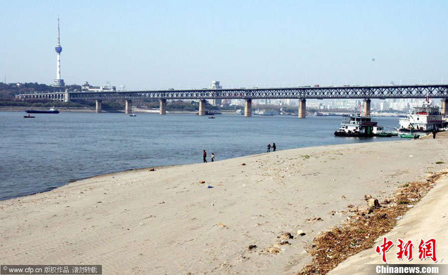 12月7日,在長江武漢市天興洲水域,大量沙洲露出江面,形成大大小小的沙丘,分布在水岸。據(jù)悉,近期,由于長江中下游地區(qū)持續(xù)多日的干燥少雨的天氣,長江漢口水位接近枯水期的標(biāo)植。金思柳 攝 圖片來源:CFP視覺中國