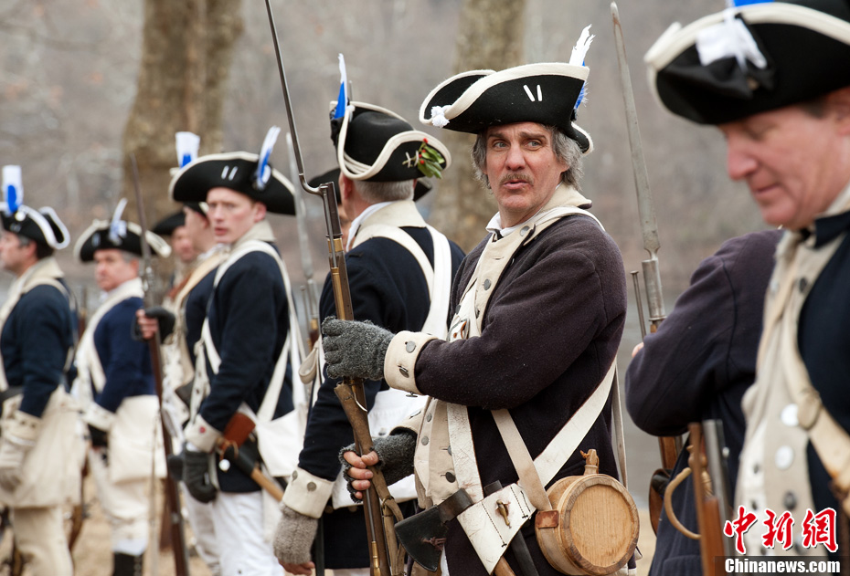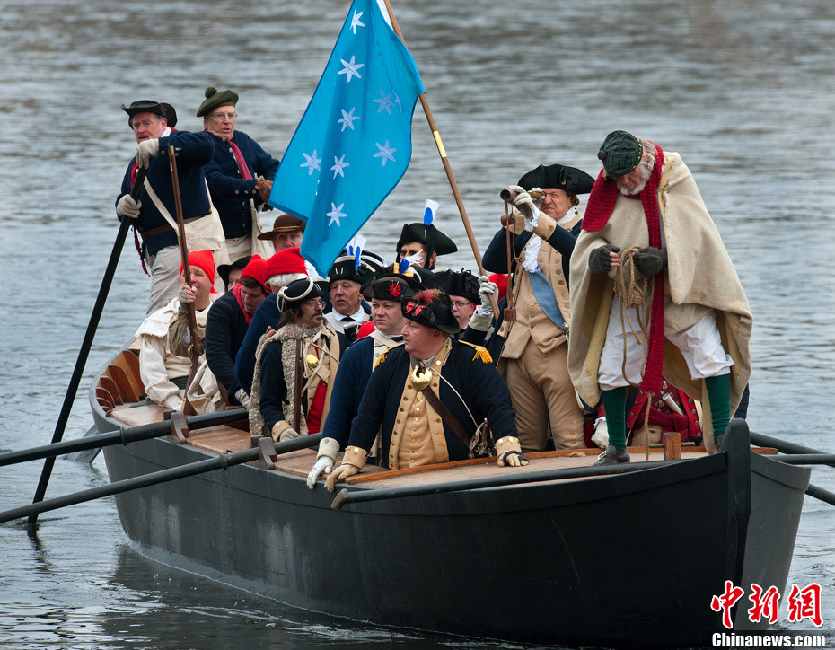 12月25日圣誕節(jié),在美國賓夕法尼亞州華盛頓橫渡歷史公園,身著美國獨(dú)立戰(zhàn)爭(zhēng)期間大陸軍軍裝的“士兵們”在“喬治·華盛頓”(右二)的引領(lǐng)下乘船渡過特拉華河。