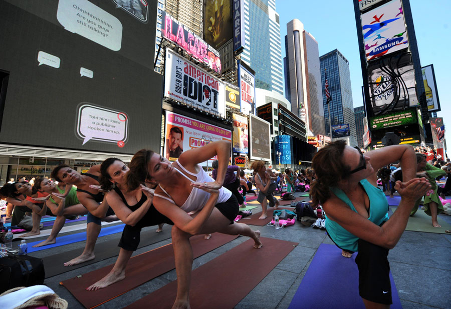 6月21日,數(shù)千瑜伽愛好者在美國紐約時(shí)報(bào)廣場(chǎng)用集體瑜伽的方式迎接夏至的到來。