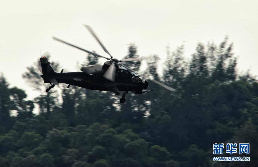 2012年11月11日,國產(chǎn)武直10武裝直升機(jī)在珠海三灶機(jī)場進(jìn)行飛行訓(xùn)練。當(dāng)日,我國自主研制生產(chǎn)的武直10武裝直升機(jī)在珠海三灶機(jī)場進(jìn)行了約20分鐘的適應(yīng)性飛行訓(xùn)練,做出倒飛、萊維斯曼機(jī)動(dòng)、高速大角度俯沖、低空小半徑盤旋等動(dòng)作,展現(xiàn)出其優(yōu)異性能,引來航展現(xiàn)場觀眾頻頻喝彩。楊光 攝 圖片來源:新華網(wǎng)