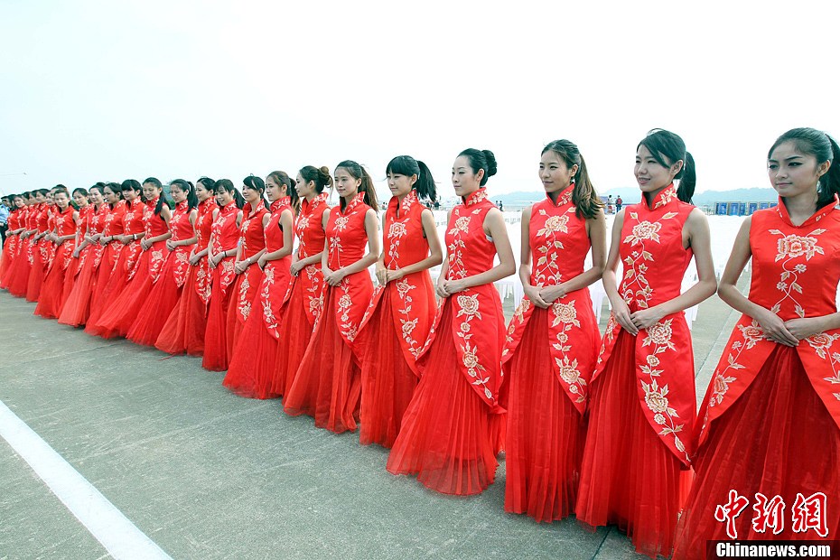 11月12日,準備為珠海第九屆中國航展開幕式服務(wù)的禮儀小姐在風(fēng)中彩排,成為亮麗的風(fēng)景線。中新社發(fā) 洪少葵 攝