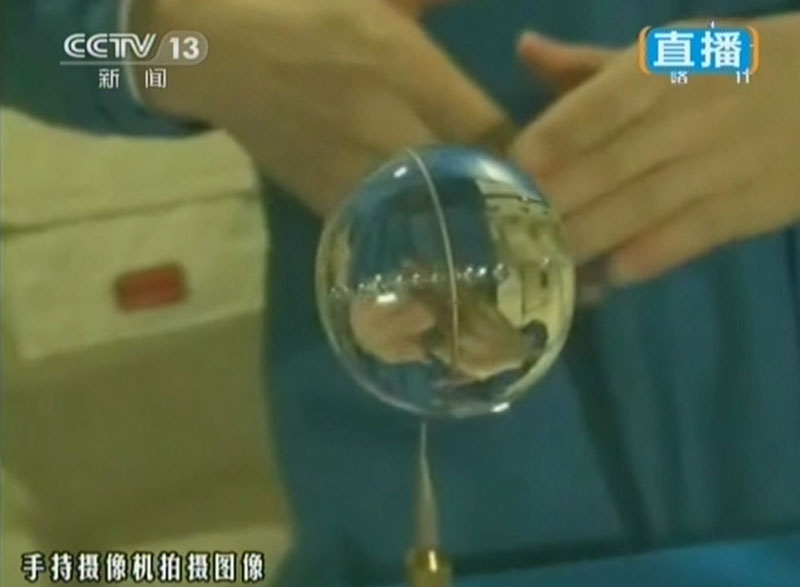6月20日上午10時(shí)許,神舟十號(hào)航天員進(jìn)行中國首次太空授課,女航天員王亞平擔(dān)任主講,成為中國首位“太空教師”。圖為王亞平“玩水球”。(視頻截圖)