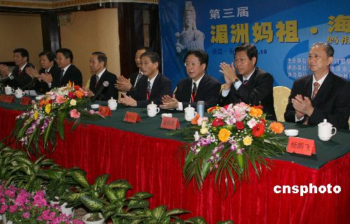 第三屆湄洲媽祖·海峽論壇10月30日在媽祖故鄉(xiāng)福建莆田開幕。全國政協(xié)副主席張克輝發(fā)來賀信,中國僑聯(lián)主席林兆樞出席開幕式。來自中國、菲律賓、日本、澳大利亞、新西蘭、馬來西亞、印尼、新加坡、巴拉圭、南非、荷蘭、臺灣、香港等13個(gè)國家和地區(qū)的一百多名僑領(lǐng)以及媽祖文化專家、學(xué)者,將圍繞“媽祖文化與華人華僑”主題進(jìn)行為期兩天的研討交流。出席開幕式的還有福建省政協(xié)副主席、統(tǒng)戰(zhàn)部長張燮飛等。中新社發(fā) 張勤 攝