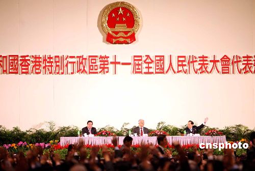 1月3日,第十一屆港區(qū)全國人大代表選舉會議,在灣仔會展中心舉行第一次全體會議,選出15名主席團(tuán)成員,行政長官曾蔭權(quán)任主席團(tuán)常務(wù)主席。中新社發(fā) 洪少葵 攝