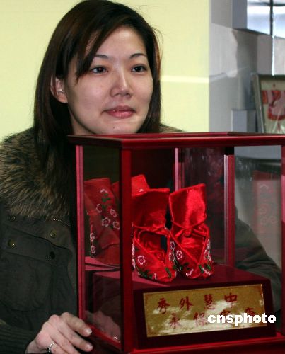 一月三日,一個名為“絕代三寸,風華金蓮”——臺灣人與三寸金蓮的展覽在臺灣故事館展出。目的在于讓民眾通過了解三寸金蓮鞋產(chǎn)生的歷史和演變,進而了解曾流行于大陸和臺灣的纏足文化。展覽共展出由臺北縣土城廣川醫(yī)院院長,也是三寸金蓮文物館館長的柯基生收集的三寸金蓮鞋真品四十六件。圖為工作人員正在向觀眾展示臺灣婦女曾穿過的三寸金蓮鞋。中新社發(fā) 陳立宇 攝