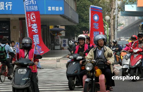 一月十日,距離臺灣“立委”選舉日只有兩天,臺北選戰(zhàn)進入白熱化。圖為一名“立委”候選人的選務(wù)團隊,將拉票彩旗插在摩托車上穿梭于臺北街頭造勢。中新社發(fā) 孫自法 攝