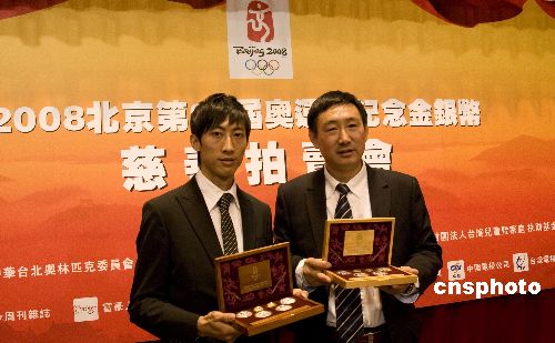 由中國臺北奧委會和臺灣大洋金銀幣有限公司共同主辦的“二00八北京第二十九屆奧運(yùn)會紀(jì)念金銀幣慈善拍賣會”,將于一月二十七日下午在臺北信義誠品店展演廳登場,拍賣所得和拍賣底價的價差,將全數(shù)捐給財團(tuán)法人臺灣兒童暨家庭扶助基金會,幫助弱勢兒童過好年。圖為臺灣的上屆奧運(yùn)跆拳道冠軍朱木炎(左一),與臺灣大洋金銀幣有限公司總經(jīng)理畢海(右一),在一月二十五日的記者會上展示將拍賣的二00八北京奧運(yùn)貴金屬金銀紀(jì)念幣。中新社發(fā) 陳立宇 攝