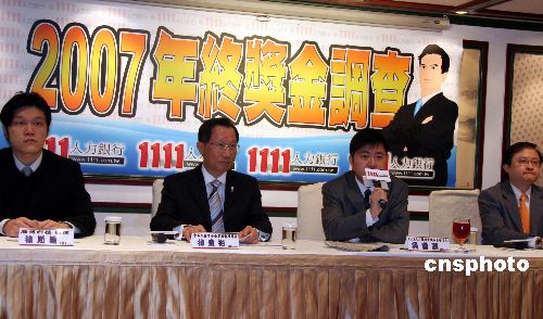 一月二十八日,臺(tái)灣1111人力銀行在臺(tái)北發(fā)布其最新完成的二○○七年終獎(jiǎng)金大調(diào)查,結(jié)果顯示:與上一年度僅一成三受訪者沒有年終可領(lǐng)相比,二○○七年有超過(guò)三成上班族確定領(lǐng)不到任何年終,增長(zhǎng)一百五十三個(gè)百分點(diǎn)。一成五企業(yè)不發(fā)放二○○七年終獎(jiǎng),不賺錢、景氣差是主要原因。中新社發(fā) 孫自法 攝