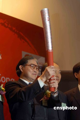 一月三十日,中國香港體育協(xié)會(huì)暨香港奧林匹克委員會(huì)會(huì)長霍震霆在新聞發(fā)布會(huì)上,展示北京奧運(yùn)會(huì)火炬。港協(xié)暨奧林匹克委員會(huì)當(dāng)天宣布,北京奧運(yùn)火炬?zhèn)魉蛯⒂诮衲晡逶露盏竭_(dá)香港,一百二十名火炬手,會(huì)在港九、新界等六個(gè)路段傳送火炬。中新社發(fā) 譚達(dá)明 攝