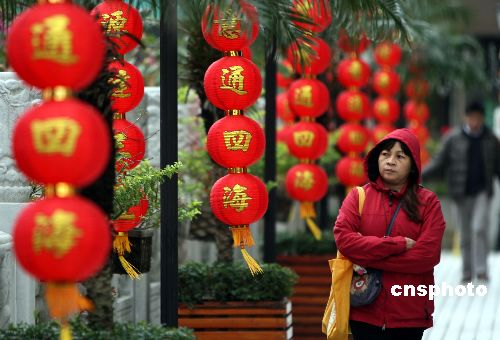 一月三十一日,一位香港市民走過(guò)街頭大紅的新春裝飾。當(dāng)日,香港天文臺(tái)表示,今早錄得的最低氣溫為八點(diǎn)五度,是入冬以來(lái)的最低紀(jì)錄。中新社發(fā) 武仲林 攝