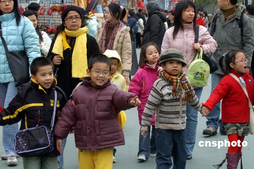 二月一日,香港天氣持續(xù)寒冷,小朋友外出均穿上厚厚的御寒衣物。中新社發(fā) 譚達明 攝