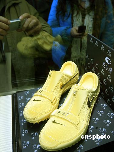 農(nóng)歷新年喜慶時(shí)節(jié),香港沙田馬場(chǎng)舉辦黃金藝術(shù)珍品展覽,展出二十多件設(shè)計(jì)獨(dú)特、手工精致的黃金藝術(shù)珍品。圖中以有世界飛人之稱劉翔破世界記錄時(shí),以其所穿跑鞋實(shí)物原大打造的黃金跑鞋,引來(lái)眾多觀眾興趣。這雙黃金跑鞋長(zhǎng)二十六厘米,黃金重約十六兩,價(jià)值超過(guò)二十三萬(wàn)多港元。中新社發(fā) 王麗南 攝