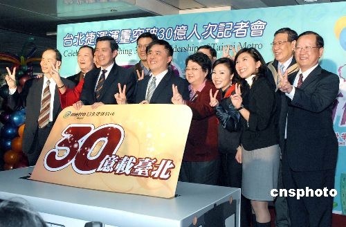 臺北市捷運運量累計突破三十億人次。圖為三日下午臺北捷運臺北車站內(nèi),臺北市前任市長馬英九、現(xiàn)任市長郝龍斌等參加慶祝記者會。中新社發(fā) 曾嘉 攝