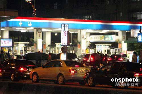 臺灣島內(nèi)二十八日凌晨全面調(diào)升油價,當(dāng)晚上各加油站排滿汽車長龍。圖為中油公司附近一個加油站場景。中新社發(fā) 陳立宇 攝