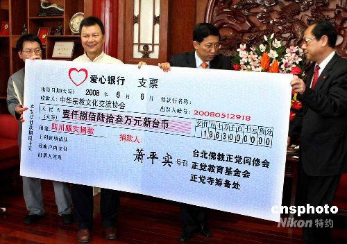 6月6日,臺灣佛教正覺同修會(huì)、正覺教育基金會(huì)、正覺寺籌備處等在北京國家宗教事物局向四川地震災(zāi)區(qū)捐獻(xiàn)1863萬元新臺幣,以幫助四川災(zāi)區(qū)受傷人員、學(xué)校重建、寺廟修繕等。圖為捐贈(zèng)儀式上,臺灣佛教正覺同修會(huì)董事長張公仆先生(左二),向國家宗教事物局副局長蔣永堅(jiān)(右二)遞交支票樣本。中新社發(fā) 宋吉河 攝