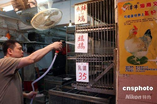 六月九日,香港各街市活雞攤檔提前兩天進行休市清潔,預(yù)防禽流感。六月七日,香港保安道街市的五個雞只樣本,確認帶有H5N1禽流感病毒,特區(qū)政府將禽流感的應(yīng)變級別提升為“嚴重”級別。中新社發(fā) 武仲林 攝