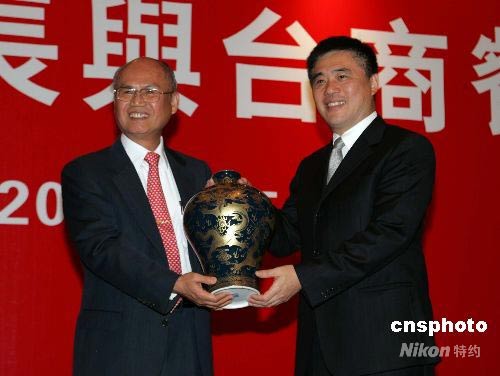 6月25日晚,臺(tái)北市長(zhǎng)郝龍斌在上海與臺(tái)商餐敘時(shí),贊賞臺(tái)商不僅在家鄉(xiāng)有愛(ài)心,在大陸也一樣有愛(ài)心,特別是此次四川地震發(fā)生后,臺(tái)商踴躍賑災(zāi)精神可嘉。圖為郝龍斌與上海臺(tái)商協(xié)會(huì)會(huì)長(zhǎng)李茂盛互贈(zèng)禮品。