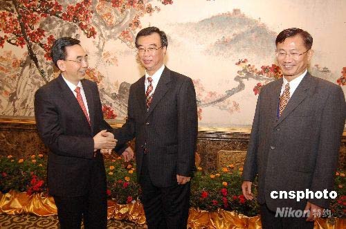 中國(guó)國(guó)民黨高雄市委員會(huì)廣州訪問(wèn)團(tuán)一行,七月十二日搭乘高雄至廣州周末包機(jī)抵穗。中共廣州市委書記朱小丹(左一),在廣州東方賓館會(huì)見(jiàn)該訪問(wèn)團(tuán)全體成員。中新社發(fā) 柯小軍 攝
