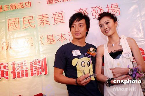 由香港政制及內(nèi)地事務(wù)局贊助,國(guó)民教育中心策劃,有關(guān)基本法及發(fā)揚(yáng)奧運(yùn)精神系列活動(dòng)即將在香港推出。九月二十日,參與“一國(guó)兩制”與“基本法”廣播劇演出的影視紅星方力申、周麗淇出席記者會(huì)與青少年分享心得。中新社發(fā) 洪少葵 攝