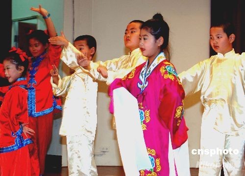 十月一日,參加“2008·陽光海峽”兩岸快樂小天使活動營的福建快樂小天使走進(jìn)臺北木柵小學(xué)與在校小朋友進(jìn)行交流和聯(lián)歡。圖為福建快樂小天使為臺北木柵小學(xué)師生獻(xiàn)上精彩的京劇表演,博得喝彩。中新社發(fā) 劉可耕 攝